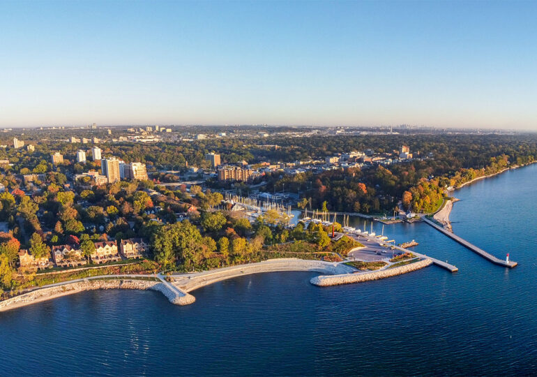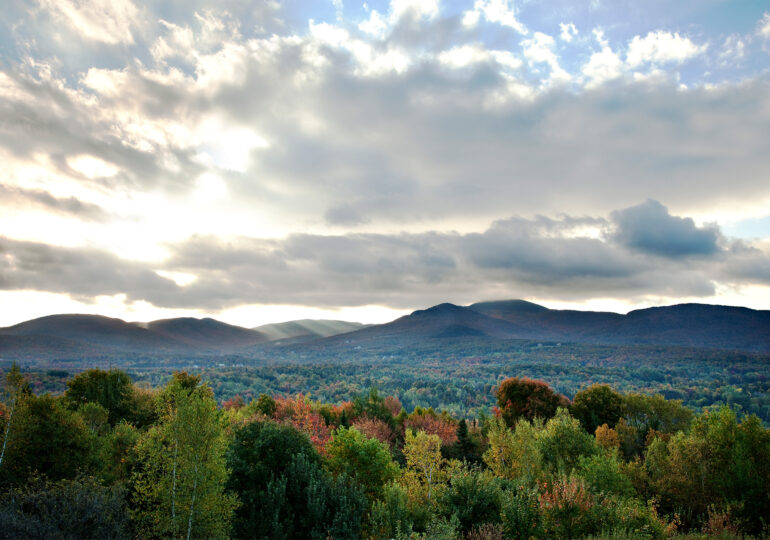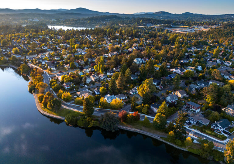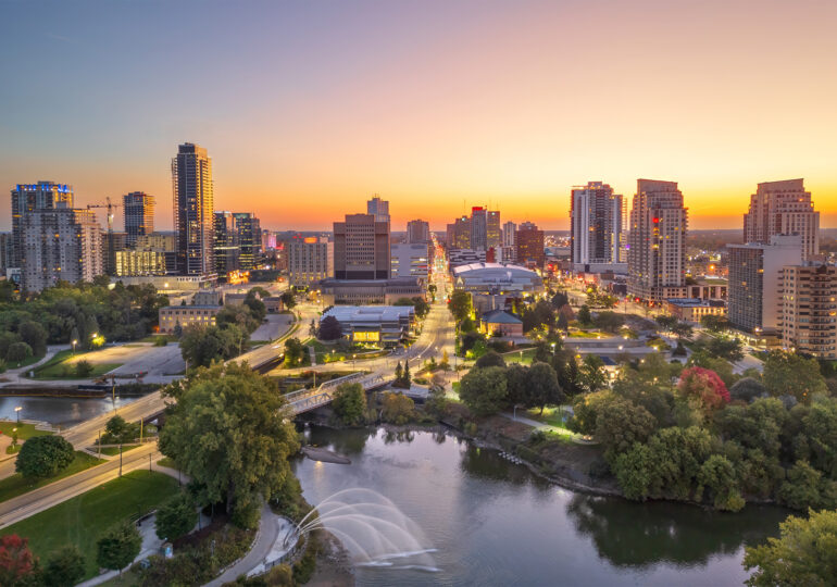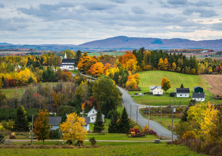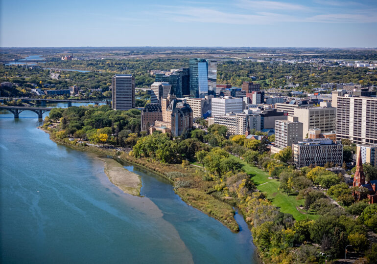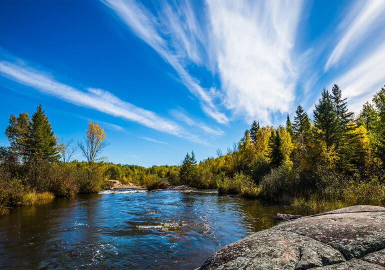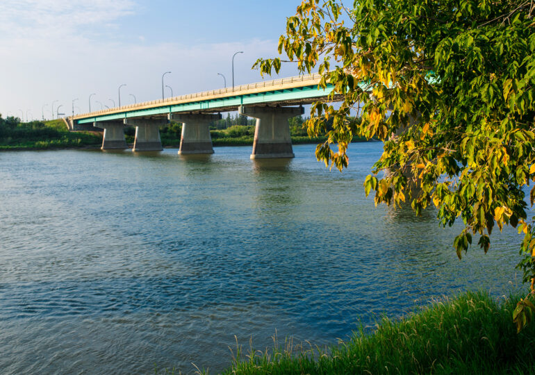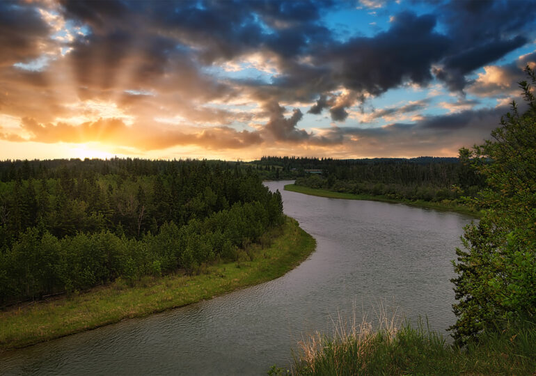 Majestic view of a serene river winding through lush greenery and mountainous terrain in Alberta, Canada, under dramatic clouds.