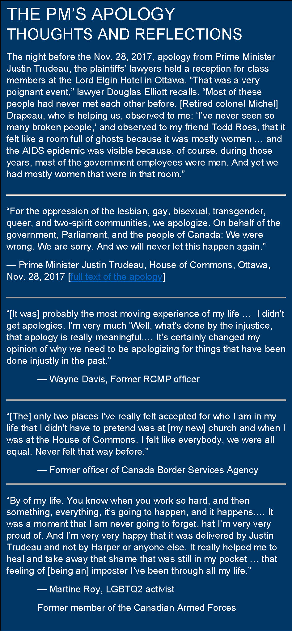 “For the oppression of the lesbian, gay, bisexual, transgender, queer, and two-spirit communities, we apologize. On behalf of the government, Parliament, and the people of Canada: We were wrong. We are sorry. And we will never let this happen again.”